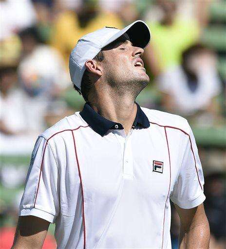 John Isner of the U.S. reacts to a missed shot during his Davis Cup singles match against Australia's Samuel Groth in Melbourne, Australia, Friday, March 4, 2016.(AP Photo/Andrew Brownbill) The Associated Press