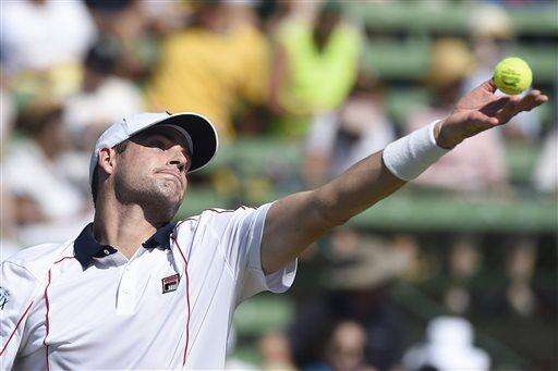 John Isner of the U.S. serves during his Davis Cup singles match against Australia's Samuel Groth in Melbourne, Australia, Friday, March 4, 2016.(AP Photo/Andrew Brownbill) The Associated Press
