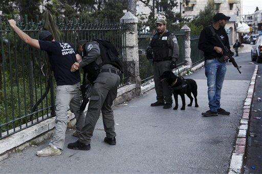 An Israeli policeman frisks a Palestinian after a shooting attack in Jerusalem Tuesday, March 8, 2016. A Palestinian opened fire and wounded two police officers before he was shot an killed, police said. (AP Photo/Mahmoud Illean)