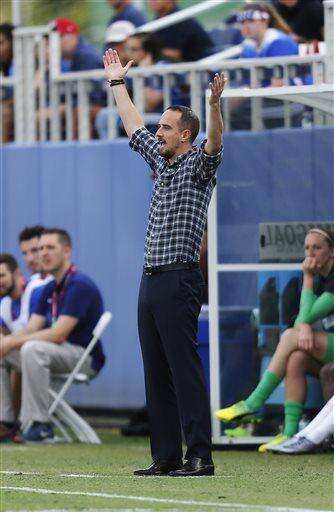England coach Mark Sampson reacts after a hard take-down by France during the first half of a soccer game in the SheBelieves Cup, Wednesday, March 9, 2016, in Boca Raton, Fla. The game ended in a 0-0 tie. (AP Photo/Joel Auerbach)