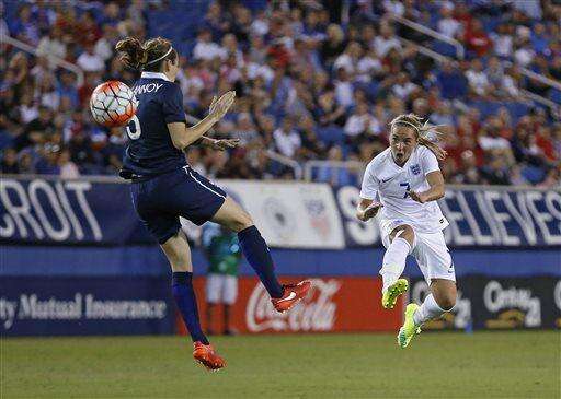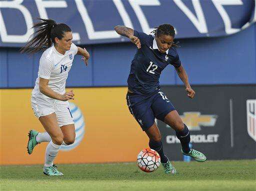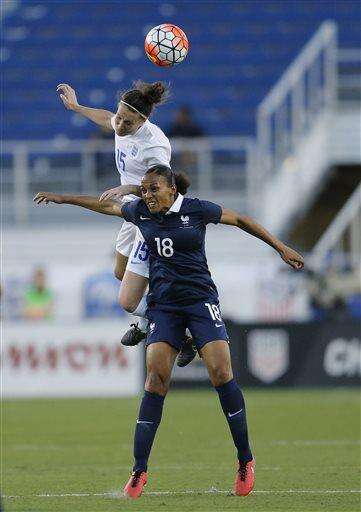 Englandâs Casey Stoney (15) and Franceâs Marie-Laure Delie (18) battle for a head ball during the second half of a women's soccer game in the SheBelieves Cup, Wednesday, March 9, 2016,  in Boca Raton, Fla. The game ended in a 0-0 tie. (AP Photo/Joel Auerbach)