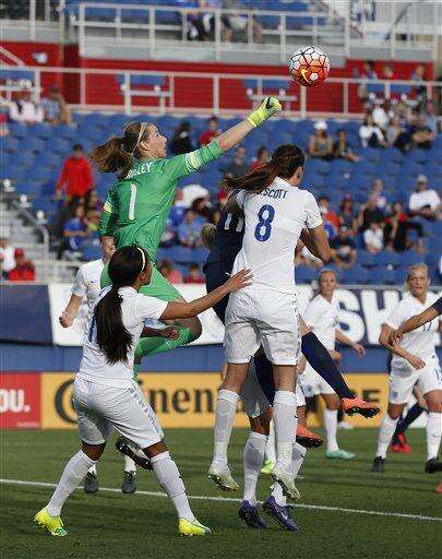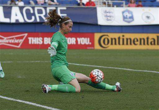 Englandâs goalkeeper Karen Bardsley (1) stops a shot during the first half of a women's soccer game in the SheBelieves Cup, Wednesday, March 9, 2016, in Boca Raton, Fla. (AP Photo/Joel Auerbach)