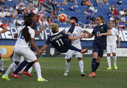 Franceâs Claire Lavogez (11) does a bicycle kick but is unable to score against England during the first half of a women's soccer game in the SheBelieves Cup, Wednesday, March 9, 2016, in Boca Raton, Fla. (AP Photo/Joel Auerbach)