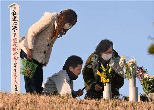 People offer incense stick to mourn the victims of the deadly March 11, 2011 earthquake and tsunami, in Natori, Miyagi prefecture, northeastern Japan early Friday, March 11, 2016. Japan marks the fifth anniversary of the disaster on Friday. The sign reads "We never forget." (Jun Hirata/Kyodo News via AP) JAPAN OUT, MANDATORY CREDIT