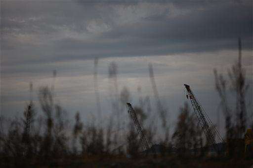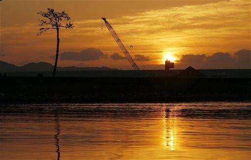 In this March 7, 2016 photo, cranes are seen through tall weeds at new sea wall at a coast line in Rikuzentakata, Iwate Prefecture, northeastern Japan. Japan on Friday, March 11 marked the fifth anniversary of the powerful earthquake and subsequent tsunami that hit Japan, swallowing coastal villages, leaving more than 18,000 people dead or missing and devastating large swaths of the country's northeastern coastal area. Some places are still unlivable and require massive reconstruction to restore infrastructure, houses and people's lives. (AP Photo/ Eugene Hoshiko)