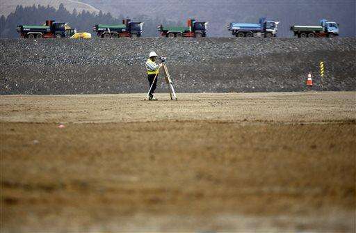 In this March 8, 2016 photo, a surveyor works near trucks in queue to dump soil for ground-level raising work area in Minamisanriku, Miyagi Prefecture, northern Japan. Japan on Friday, March 11 marked the fifth anniversary of the powerful earthquake and subsequent tsunami that hit Japan, swallowing coastal villages, leaving more than 18,000 people dead or missing and devastating large swaths of the country's northeastern coastal area. Some places are still unlivable and require massive reconstruction to restore infrastructure, houses and people's lives. (AP Photo/ Eugene Hoshiko)