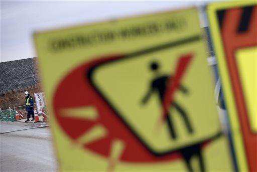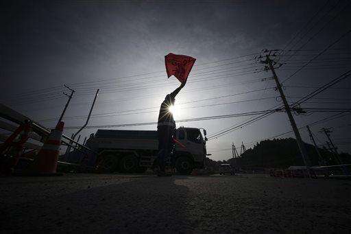 In this March 8, 2016 photo, a truck guide controls the traffic at the entrance of a reconstruction area in Minamisanriku, Miyagi Prefecture, northern Japan. Japan on Friday, March 11 marked the fifth anniversary of the powerful earthquake and subsequent tsunami that hit Japan, swallowing coastal villages, leaving more than 18,000 people dead or missing and devastating large swaths of the country's northeastern coastal area. Some places are still unlivable and require massive reconstruction to restore infrastructure, houses and people's lives. (AP Photo/ Eugene Hoshiko)