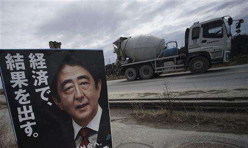 In this March 7, 2016 photo, a concrete mixture truck passes by a poster featuring Japanese Prime Minister Shizo Abe with Japanese read as "Show the result by economy" near the ground-level raising work area in Rikuzentakata, Iwate Prefecture, northern Japan. Japan on Friday, March 11 marked the fifth anniversary of the powerful earthquake and subsequent tsunami that hit Japan, swallowing coastal villages, leaving more than 18,000 people dead or missing and devastating large swaths of the country's northeastern coastal area. Some places are still unlivable and require massive reconstruction to restore infrastructure, houses and people's lives. (AP Photo/ Eugene Hoshiko)