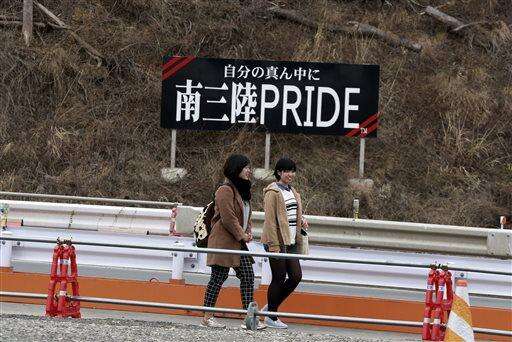 In this March 7, 2016 photo, women walk past a sign in Japanese reads as "In your center, Minamisanriku Pride" in Minamisanriku, Miyagi Prefecture, northern Japan. Japan on Friday, March 11 marked the fifth anniversary of the powerful earthquake and subsequent tsunami that hit Japan, swallowing coastal villages, leaving more than 18,000 people dead or missing and devastating large swaths of the country's northeastern coastal area. Some places are still unlivable and require massive reconstruction to restore infrastructure, houses and people's lives. (AP Photo/Eugene Hoshiko)