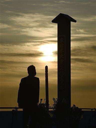 A man visits a monument to mourn the victims of the deadly March 11, 2011 earthquake and tsunami, in Sendai, Miyagi prefecture, northeastern Japan early Friday, March 11, 2016. Japan marks the fifth anniversary of the disaster on Friday. (Nobuki Ito/Kyodo News via AP) JAPAN OUT, MANDATORY CREDIT