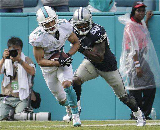 FILE - In this Nov. 22, 2015 file photo, Miami Dolphins cornerback Brent Grimes (21) intercepts the ball as Dallas Cowboys wide receiver Dez Bryant (88) attempts top tackle during the first half of an NFL football game in Miami Gardens, Fla. Four-time Pro Bowl cornerback Grimes has agreed to contracts with the Tampa Bay Buccaneers in free agency. (AP Photo/Lynne Sladky, File) The Associated Press