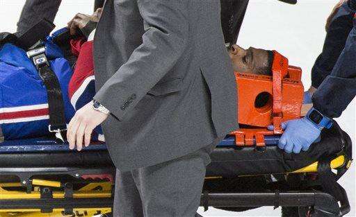 MONTREAL (AP) - Montreal defenseman P.K. Subban was taken off the ice on a stretcher after being hit on the side of the head by a teammate late in the Canadiens' 3-2 victory over the Buffalo Sabres on Thursday night.