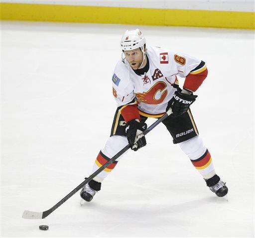FILE - This Nov. 24, 2015 file photo shows Calgary Flames' Dennis Wideman moving the puck during the first period of an NHL hockey game against the Anaheim Ducks in Anaheim, Calif. Wideman's 20-game suspension for physically abusing the official has been reduced to 10 games by an independent arbitrator, Friday, March 11, 2016. The National Hockey League Players' Association requested an appeal after commissioner Gary Bettman upheld Wideman's 20-game ban for cross-checking a linesman on Jan. 27. (AP Photo/Jae C. Hong, file) The Associated Press