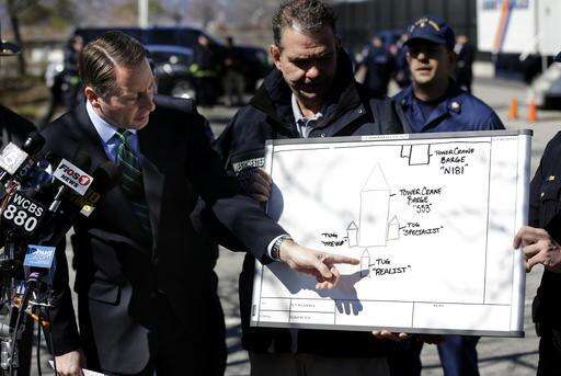 Westchester County Executive Rob Astorino, left, uses a diagram to explain the circumstances of a fatal collision on the water in Tarrytown, N.Y., Saturday, March 12, 2016. A tugboat crashed into a barge on the Hudson River north of New York City early Saturday killing at least one crew member and leaving two still missing. (AP Photo/Seth Wenig) The Associated Press