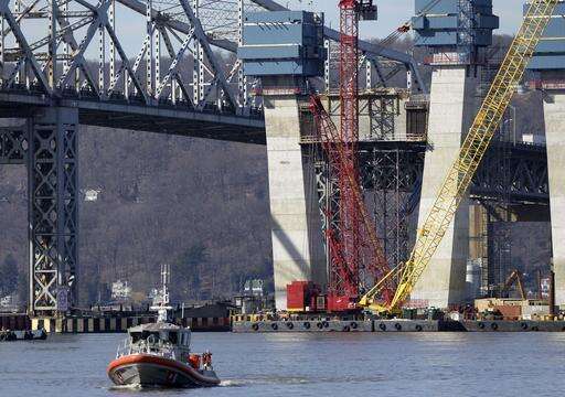 A Coast Guard boat passes near the site of a fatal collision in the water underneath the Tappan Zee Bridge in Tarrytown, N.Y., Saturday, March 12, 2016. A tugboat crashed into a barge on the Hudson River north of New York City early Saturday killing at least one crew member and leaving two still missing. (AP Photo/Seth Wenig) The Associated Press