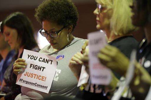 Alicia Street holds a sign as she sits in the audience during a meeting of the Ferguson City Council, Tuesday, March 15, 2016, in Ferguson, Mo. The city council unanimously agreed to accept a U.S. Justice Department plan to overhaul its embattled police force and municipal court system during the meeting. (AP Photo/Jeff Roberson) The Associated Press