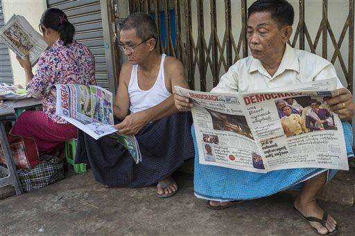 People read newspapers as a vendor, rear, arranges papers at her sidewalk shop Tuesday, March 15, 2016, in Yangon, Myanmar. Myanmar's parliament votes Tuesday to pick the country's next president from a group of three final candidates, including a front runner who is a longtime confidant of Nobel laureate Aung San Suu Kyi. (AP Photo/Hkun Lat)