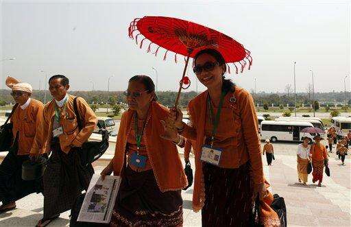 Lawmakers of the National League for Democracy party (NLD) arrive for a session at Myanmar parliament in Naypyitaw, Myanmar, Monday, March 14, 2016. Myanmar's parliament vote on Tuesday to pick the country's next president from a group of three final candidates, including a front runner who is a longtime confidant of Nobel laureate Suu Kyi. (AP Photo/Aung Shine Oo)
