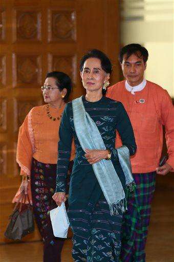 National League for Democracy party (NLD) leader Aung San Suu Kyi, center, arrives in Manama's parliament in Naypyitaw, Myanmar, Tuesday, March 15, 2016. Myanmar's parliament elected Htin Kyaw as Myanmar's new president Tuesday, a watershed moment that ushers the longtime opposition party of Aung San Suu Kyi into government. (AP Photo/Gemunu Amarasinghe)