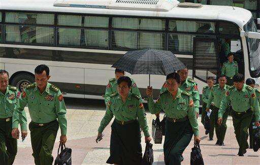Appointed lawmakers who represent Myanmar's military arrive for a parliamentary session in Naypyitaw, Myanmar, Monday, March 14, 2016. Myanmar's parliament vote on Tuesday, March 15 to pick the country's next president from a group of three final candidates, including a front runner who is a longtime confidant of Nobel laureate Suu Kyi. (AP Photo/Aung Shine Oo)