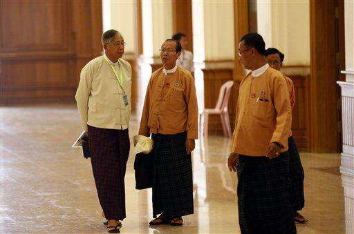 Htin Kyaw, left a presidential candidate from the National League for Democracy party, speaks with NLD lawmakers at Myanmar parliament in Naypyitaw, Myanmar, Monday, March 14, 2016. Myanmar's parliament vote on Tuesday, March 15, 2016, to pick the country's next president from a group of three final candidates, including a front runner who is a longtime confidant of Nobel laureate Aung San Suu Kyi. (AP Photo/Aung Shine Oo)
