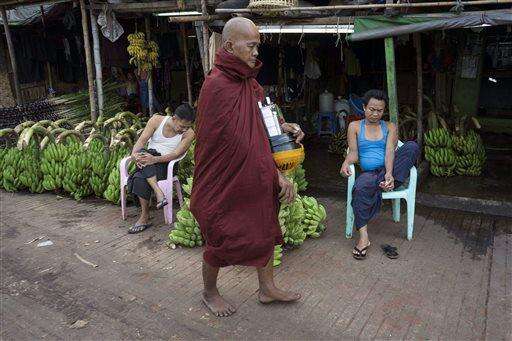 A Myanmar Buddhist monk walks to collect morning alms as vendors selling bunches of banana wait for customers near a jetty Tuesday, March 15, 2016, in Yangon, Myanmar. Myanmar's parliament votes Tuesday, March 15, 2016, to pick the country's next president from a group of three final candidates, including a front runner who is a longtime confidant of Nobel laureate Aung San Suu Kyi. (AP Photo/Hkun Lat)