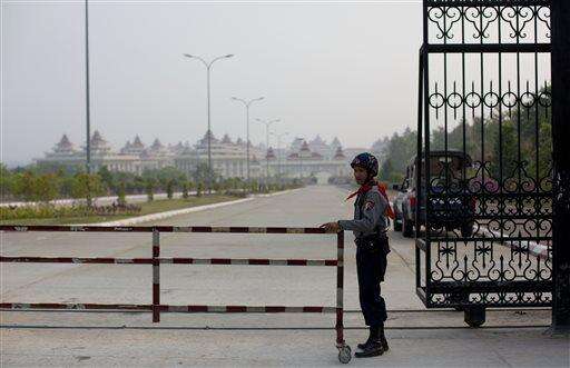 A Myanmar police officer stand guards at the entrance to Myanmar parliament in Naypyitaw, Myanmar, Tuesday, March 15, 2016. Myanmar's lawmakers gather Tuesday to vote to pick the country's next president from a group of three final candidates. (AP Photo/Gemunu Amarasinghe)