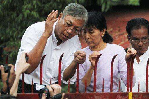FILE - In this Nov. 13, 2010, file photo, Myanmar's pro-democracy leader Aung San Suu Kyi, center, speaks with aide Htin Kyaw, left, as she addresses her supporters from the front gates of her home after her release from house arrest in Yangon, Myanmar. For years he walked alongside Nobel laureate Suu Kyi, a quiet confidante as she campaigned for democracy in Myanmar. On Tuesday, March 15, 2016, with her blessings, Htin Kyaw will become the countryâs president. (AP Photo/Gemunu Amarasinghe, File)