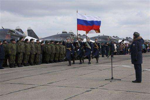 In this photo provided by the Russian Defense Ministry Press Service, guards walk past a lineup of troops during a welcome ceremony for Russian military personnel who returned from Syria at an airbase near the Russian city Voronezh, Tuesday, March 15, 2016. Russian warplanes and troops stationed at Russia's air base in Syria started leaving for home on Tuesday after a partial pullout order from President Vladimir Putin the previous day, a step that raises hopes for progress at the newly reconvened U.N.-brokered peace talks in Geneva. (Russian Defense Ministry Press Service via AP) The Associated Press