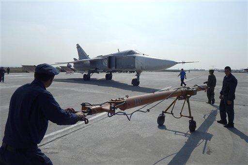 FILE - In this Friday, March 4, 2016 file photo, Russian fighter jets and bombers are parked at Hemeimeem air base in Syria. Russian warplanes have mostly stayed on the ground since the Russian- and U.S.-brokered cease-fire has begun last weekend. Russia's defense ministry said Tuesday, March 15, 2016, that the first group of warplanes stationed at the Russian air base in Syria has left for home following a pullout order from President Vladimir Putin. (AP Photo/Pavel Golovkin, File) The Associated Press
