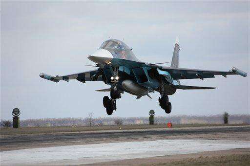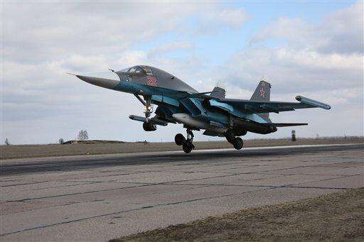 In this photo provided by the Russian Defense Ministry Press Service, Russian Su-34 bomber lands after returning from Syria at an airbase near the Russian city Voronezh, Tuesday, March 15, 2016. Russian warplanes and troops stationed at Russia's air base in Syria started leaving for home on Tuesday after a partial pullout order from President Vladimir Putin the previous day, a step that raises hopes for progress at the newly reconvened U.N.-brokered peace talks in Geneva. (Olga Balashova/Russian Defense Ministry Press Service via AP) The Associated Press