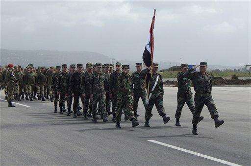 In this photo provided by the Russian Defense Ministry Press Service, Syrian troops march during a seeing off ceremony for Russian troops at Hemeimeem air base in Syria, Tuesday, March 15, 2016. Russian warplanes and troops stationed at Russia's air base in Syria started leaving for home on Tuesday after a partial pullout order from President Vladimir Putin the previous day, a step that raises hopes for progress at the newly reconvened U.N.-brokered peace talks in Geneva. (Russian Defense Ministry Press Service via AP) The Associated Press