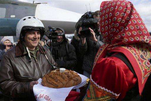 In this photo provided by the Russian Defense Ministry Press Service, a Russian pilot who returned from Syria is welcomed with traditional bread-and-salt at an airbase near the Russian city Voronezh, Tuesday, March 15, 2016. Russian warplanes and troops stationed at Russia's air base in Syria started leaving for home on Tuesday after a partial pullout order from President Vladimir Putin the previous day, a step that raises hopes for progress at the newly reconvened U.N.-brokered peace talks in Geneva. (Russian Defense Ministry Press Service via AP) The Associated Press