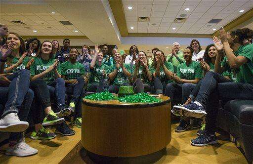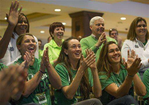 Notre Dame women's basketball players react as their placement as a No. 1 seed in the NCAA tournament is announced during the ESPN selection show on Monday, March 14, 2016, in South Bend, Ind. (Robert Franklin/South Bend Tribune via AP) MANDATORY CREDIT The Associated Press