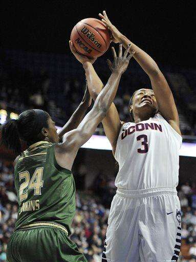 FILE- In this March 7, 2016, file photo, Connecticut’s Morgan Tuck shoots as South Florida’s Alisia Jenkins, left, defends during the first half of an NCAA college basketball game in the American Athletic Conference tournament finals at Mohegan Sun Arena in Uncasville, Conn. UConn was the top overall seed in the women's NCAA Tournament that was revealed Monday, March 14, 2016. (AP Photo/Jessica Hill) The Associated Press