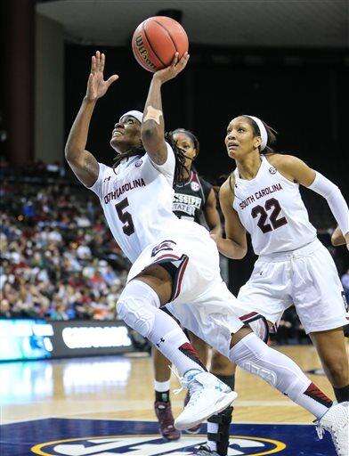 FILE- In this March 6, 2016, file photo, South Carolina guard Khadijah Sessions (5) shoots the ball in front of teammate A'ja Wilson (22) against Mississippi State during NCAA college basketball action in the Southeastern Conference women's tournament final in Jacksonville, Fla. South Carolina was named a No. 1 seeds in the women's NCAA Tournament that was revealed Monday, March 14, 2016. (AP Photo/Gary McCullough, File) The Associated Press