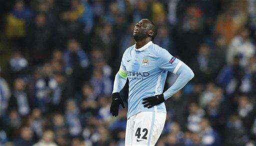 Manchester City's Yaya Toure grimaces as he looks up following a tackle during the Champions League round of 16 second leg soccer match between Manchester City and Dynamo Kiev at the Etihad Stadium, Manchester, England, Tuesday, March. 15, 2016. (AP Photo/Jon Super) The Associated Press