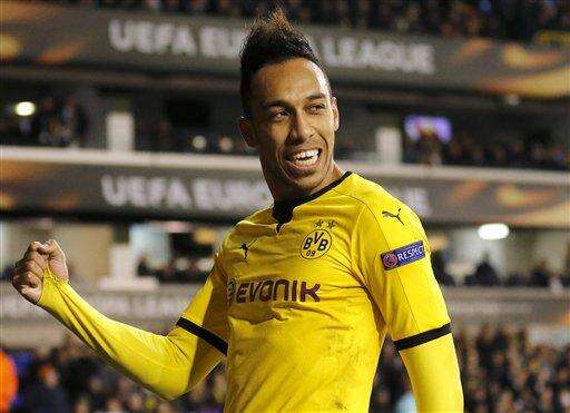 Dortmund's Pierre-Emerick Aubameyang celebrates after scoring his side's 2nd goal during the Europa League round of 16 second leg soccer match between Tottenham Hotspur and Borussia Dortmund in London, Great Britain, Thursday, March 17, 2016. (AP Photo/Frank Augstein) The Associated Press