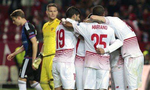 Sevilla's players celebrate after Kevin Gameiro scored against Basel during their Europa League first leg round of 16, soccer match in Seville, Spain, Thursday, March 17, 2016. (AP Photo/Miguel Morenatti) The Associated Press