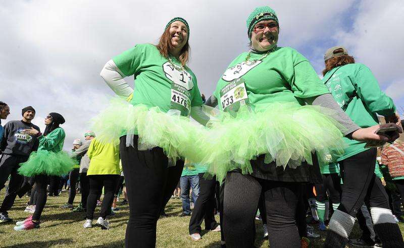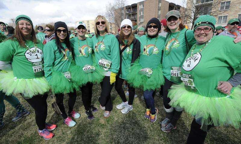 When the race began at 11 a.m. Saturday, a sea of people dressed in bright green T-shirts, tutus, shamrock socks, leprechaun hats, and other St. Patty's Day costumes made their way through downtown Arlington Heights.