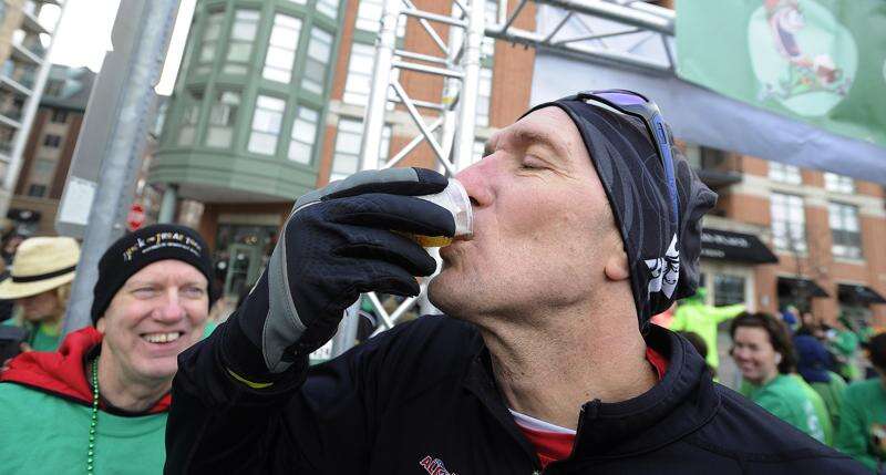 Dave Keil of Arlington Heights takes a swig of his energy drink (beer) before the Shamrock 5K Beer Run in downtown Arlington Heights on Saturday. Mark Welsh/mwelsh@dailyherald.com