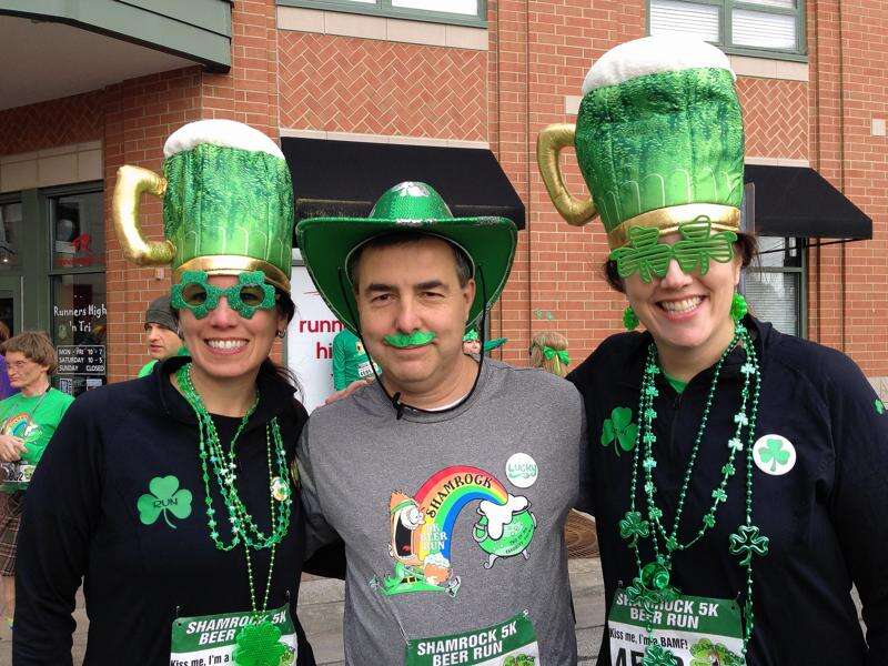 From left to right, runners Chrissy Doyle of Manhattan, Illinois, Jeff Sulski of La Grange Park, and Jen Marcussen of Bensenville wore St. Patrick's Day gear while running the Shamrock 5K Beer Run in downtown Arlington Heights Saturday. Photo by Jamie Sotonoff/jsotonoff@dailyherald.com