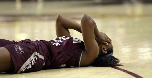 Missouri State's Tyonna Snow covers her face after falling to the floor during the second half of a first-round women's college basketball game against Texas A&M in the NCAA Tournament Saturday, March 19, 2016, in College Station, Texas. Texas A&M won 74-65.(AP Photo/David J. Phillip) The Associated Press