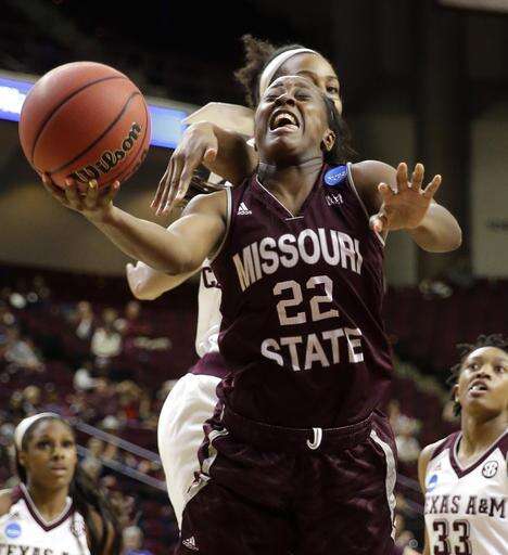 Missouri State's Tyonna Snow (22) is fouled by Texas A&M's Rachel Mitchell during the second half of a first-round women's college basketball game in the NCAA Tournament Saturday, March 19, 2016, in College Station, Texas. Texas A&M won 74-65.(AP Photo/David J. Phillip) The Associated Press
