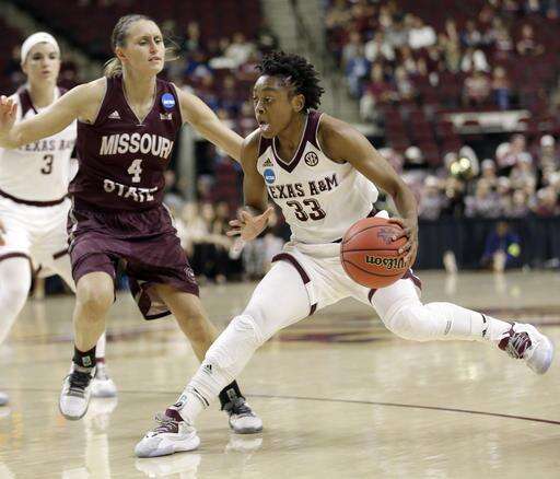 Texas A&M's Courtney Walker (33) drives past Missouri State's Kenzie Williams (4) during the second half of a first-round women's college basketball game in the NCAA Tournament Saturday, March 19, 2016, in College Station, Texas. Texas A&M won 74-65.(AP Photo/David J. Phillip) The Associated Press
