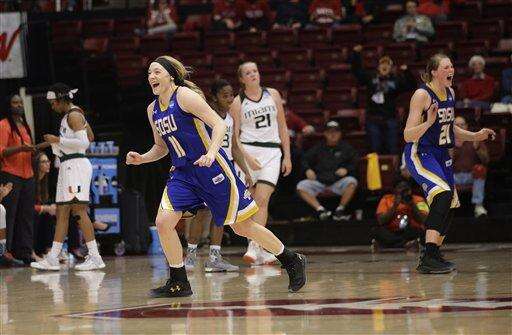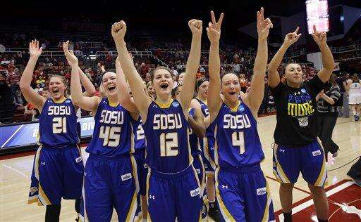 South Dakota State players celebrate after a 74-71 win over Miami in a first-round women's college basketball game in the NCAA Tournament Saturday, March 19, 2016, in Stanford, Calif. (AP Photo/Marcio Jose Sanchez) The Associated Press