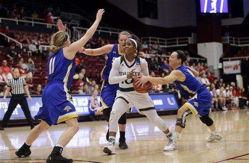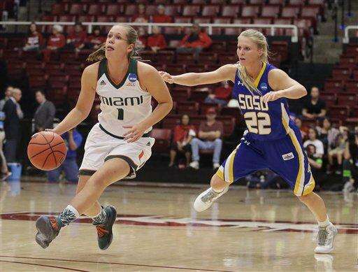 Miami guard Michelle Woods, center, drives to the basket against South Dakota State in the first half of a first-round women's college basketball game in the NCAA Tournament Saturday, March 19, 2016, in Stanford, Calif. (AP Photo/Marcio Jose Sanchez) The Associated Press