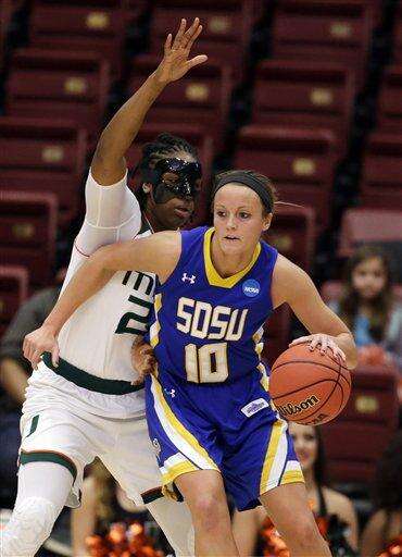 South Dakota State guard Madison Guebert (11) dribbles past Miami guard Jessica Thomas (3) in the second half of a first-round women's college basketball game in the NCAA Tournament Saturday, March 19, 2016, in Stanford, Calif. South Dakota State won 74-71. (AP Photo/Marcio Jose Sanchez) The Associated Press