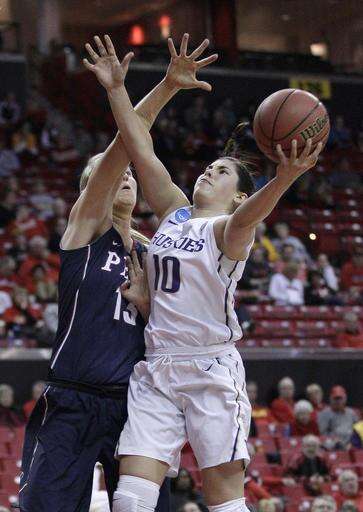 Washington guard Kelsey Plum, right, shoots against Penn center Sydney Stipanovich in the first half of an NCAA college basketball game in the first round of the NCAA tournament, Saturday, March 19, 2016, in College Park, Md. (AP Photo/Patrick Semansky) The Associated Press