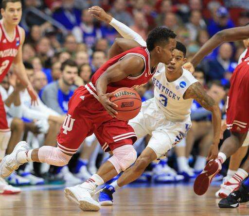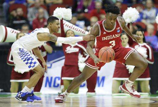 The Hoosiers have lost another player to injury, forward Juwan Morgan. He was fouled hard early in the second half by Kentucky's Isaiah Briscoe and fell on the left shoulder that's been bothering him all season. Morgan was escorted to the locker room for further examination, holding his arm.